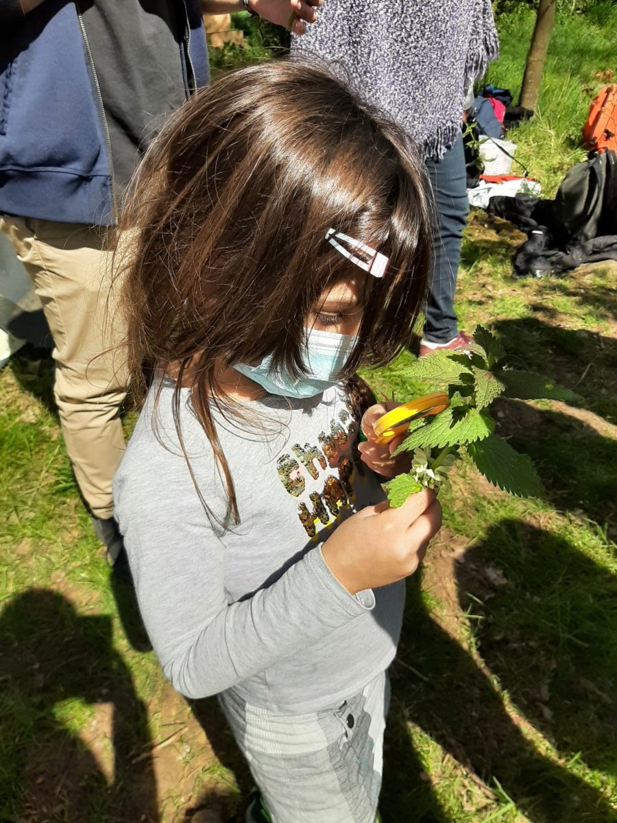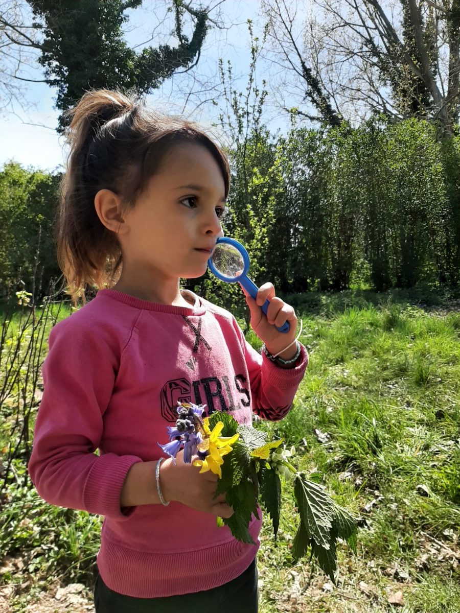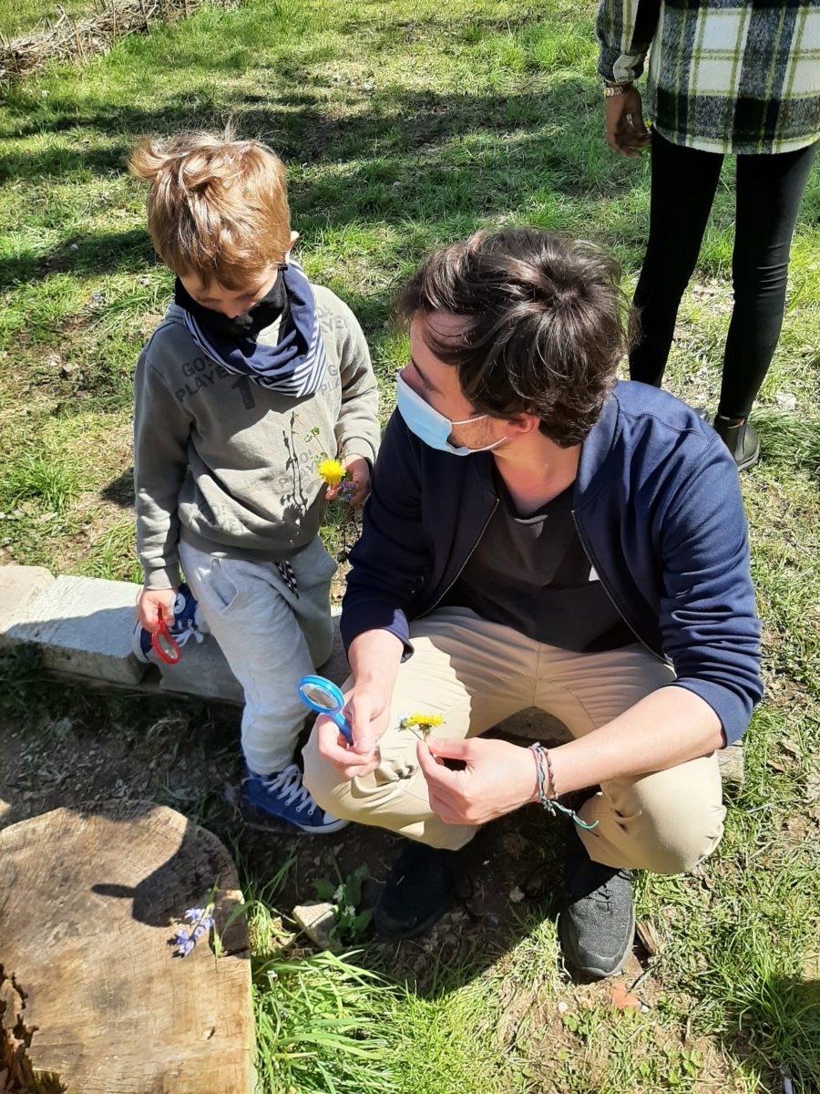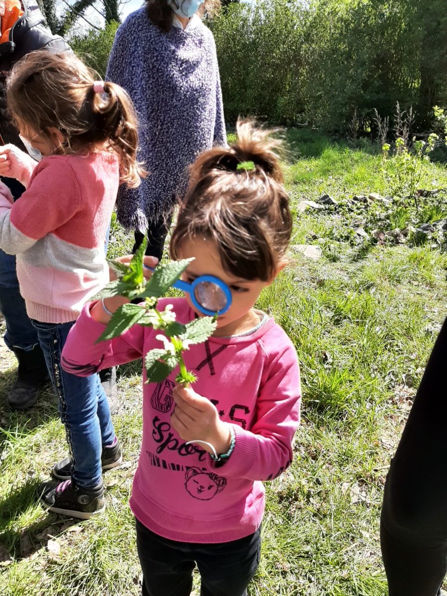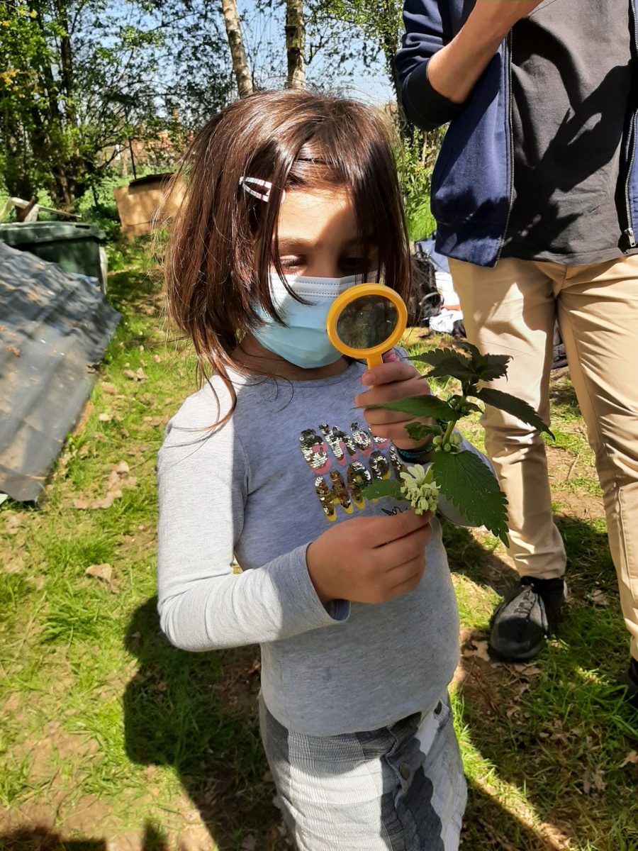 Le soleil était avec nous pour cette après-midi du jeudi 22 avril. Allez hop, direction parcelle de la Maison de Quartier, pour une première découverte des fleurs de près, de très près ! Munis de loupes à manche et de loupes de botaniste, s’il vous plaît, les enfants ont fait connaissance avec les Lamiaceae, avec les étamines, les anthères, les feuilles opposées et décussées… que de mots nouveaux, et peu importe si on ne les retient pas tout de suite !