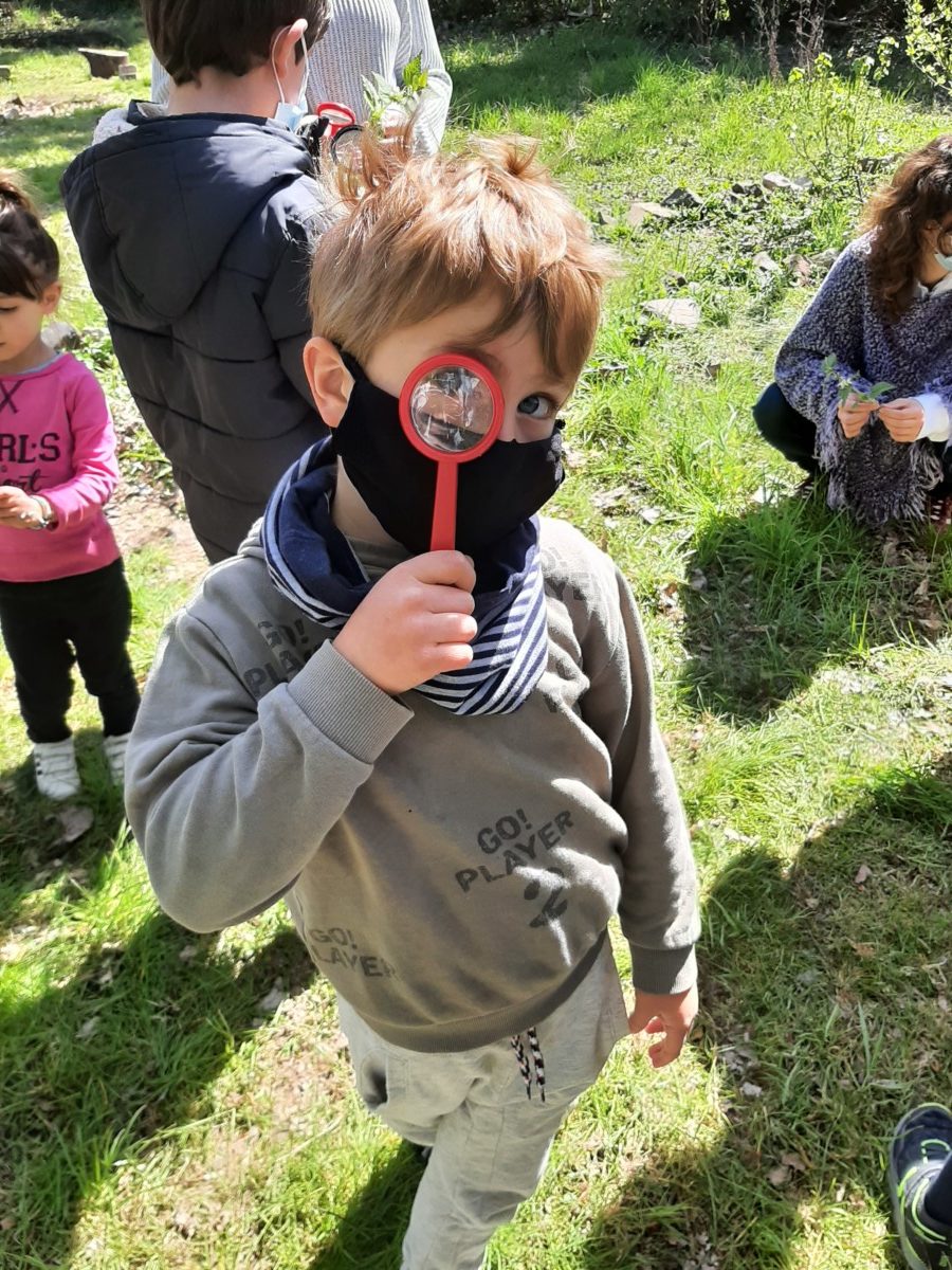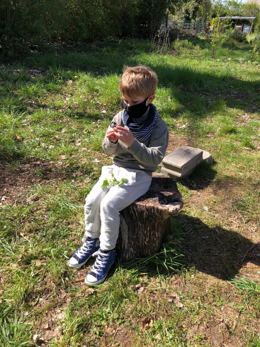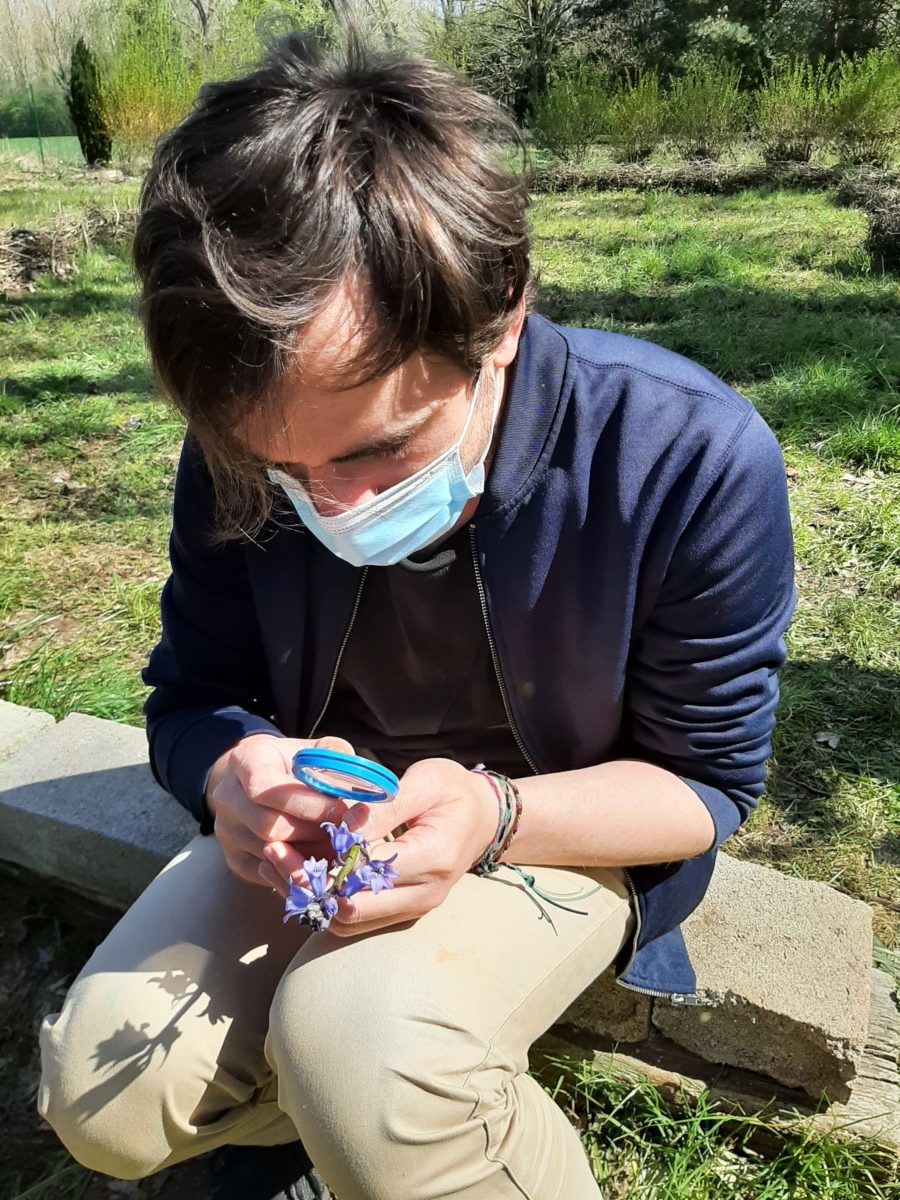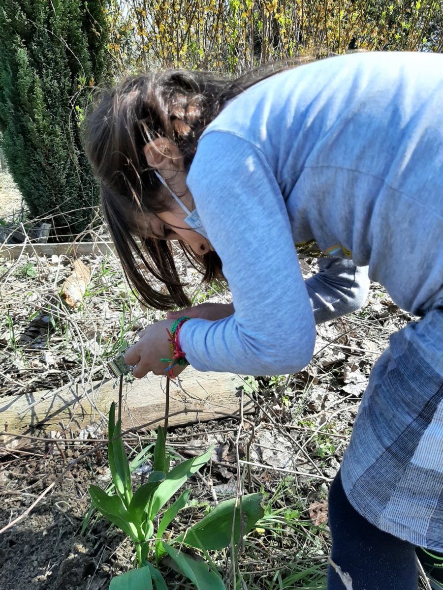 Le soleil était avec nous pour cette après-midi du jeudi 22 avril. Allez hop, direction parcelle de la Maison de Quartier, pour une première découverte des fleurs de près, de très près ! Munis de loupes à manche et de loupes de botaniste, s’il vous plaît, les enfants ont fait connaissance avec les Lamiaceae, avec les étamines, les anthères, les feuilles opposées et décussées… que de mots nouveaux, et peu importe si on ne les retient pas tout de suite !