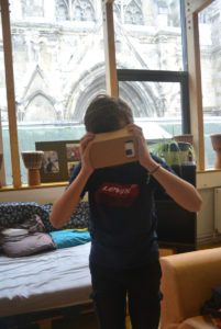 Pour finir, voici la toute première d’une future série de réalisations avec l’aide de Pierre (bénévole à la MQCV) : le casque en carton (inspiré de la GoogleCardboard) pour s’immerger dans la réalité virtuelle sans dépenser une fortune et facilement réalisable. Les ados ont testé leur prototype modèle pour créer très prochainement leur propre casque.
