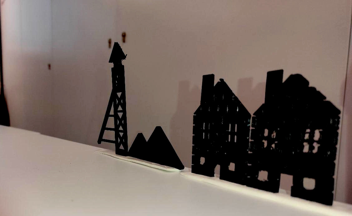 « silhouettes d’ombres » d’éléments sur le paysage minier : corons, terril, chevalement voire même de l’architecture et de la culture locale : beffrois, moulins, maisons flamandes, géants…